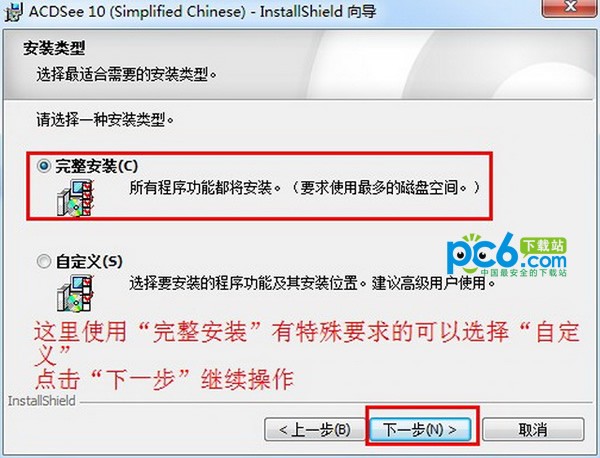 这里一般使用“完整安装”有特殊要求的可以选择“自定义”然后点击“下一步” 如图五。