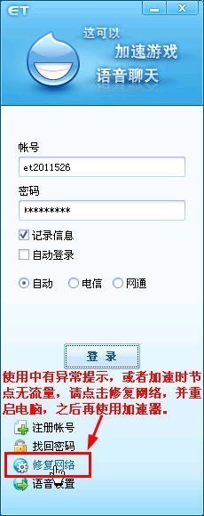 八、使用中有异常提示,或者加速时节点无流量,请点击修复网络,并重启电脑,之后再使用ET