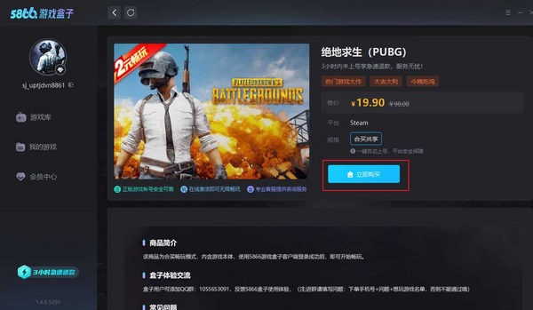 5866游戏盒子是目前最新最专业的游戏服务工具,涵盖多平台热门游戏,为玩家提供海量优质资源及高品质服务。运用安全、快捷的上号技术,为玩家提供低成本玩高品质大作的机会。 功能介绍 会员免费畅玩全部游戏。 热门大作,海量游戏1折起。 “一键上号”超便捷。 精准推荐热门游戏,让你不再选择困难! 3小时极速退款,解除后顾之忧 使用方法 1、通过搜索、下拉框滑动,选择想要玩的游戏。 2、也可根据右侧框栏分类选择游戏平台及游戏类型,找到自己喜欢的游戏; 3、选择喜欢的游戏,低价购买。 4、在支付完成界面,点击【开始游戏】,或者在左侧点【我的游戏】中点击【上号】,开始游戏。 常见问题 Q1:软件启动异常,提示初始化错误,请重新打开,反馈码:1001,怎么办? A1:这是由于驱动启动失败的原因,请重启电脑,再次运行游戏助手即可; Q2:软件启动异常,提??即重启,反馈码:100、101、102、103、104、105、106、150、151、152等,怎么办 A2:软件启动异常可能是?络、参数配置问题,请按照提示重启客户端尝试,若多次尝试仍未解决,请“联系客服”处理; Q3:游戏无法自动启动,提示请手动启动游戏,反馈码:302、401等,怎么办? A3:这是由于软件没有检测到游戏启动路径;解决方式:先手动启动Steam应用程序(启动即可,不需要输入任何信息),然后在5866游戏助手中,点击“上号”即可; Q4:本机已下载PUBG,不能启动或提示重新下载PUBG,怎么办? A4:这是由于游戏不匹配造成的,解决方式:先手动启动steam应?程序(启动即可,不需要输入任何信息),然后在5866游戏助手中,点击“上号”即可; Q5:上号过程中鼠标键盘不能用,怎么办? A5:在上号的安全检测环节,会将鼠标键盘暂时锁死,导致鼠标键盘暂不可?;无论上号是否成功,3分钟左右?标键盘即恢复正常;若3分钟后仍不可用,请重启电脑解决; Q6:提示暂无帐号可用,请稍后再试!反馈码:a122,怎么办? A6:暂示帐号可用,是帐号被其他用户使用,请稍后再试; Q7:安全检测不通过,提示有违规程序,请关闭后重试,反馈码:501、502、503、504、505、506、507、508、509等,无法上号; A7:安全检测不通过,是因为系统检测到有违规程序(外挂)等在运行,一旦检测到有外挂,系统将进行封号处理,该笔订单无法再次上号;如需使用,请关闭外挂等违规,再次购买; Q8:安全检测后,提示有违规行为,已被平台限制,反馈码:207,无法上号; A8:由于您在游戏过程中,存在违规行为(见官方说明),将会被封禁;封禁原因包括但不限于恶意组队、恶意击杀队友、挂机、散布个人隐私、种族歧视等为;请至5866-我的订单-备注,查看具体封禁原因; 请注意:游戏过程中,不要关闭5866游戏助手,一旦关闭,进行中的游戏也将同步关闭;