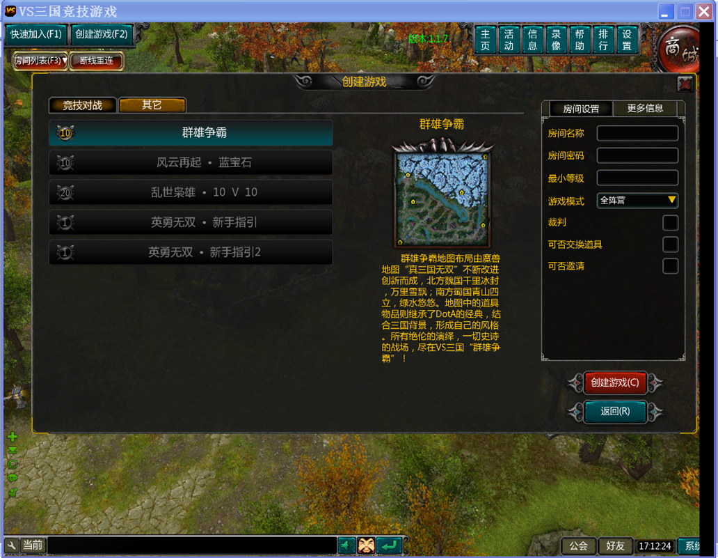 风云再起是在群雄争霸的基础上修改的5V5娱乐地图。特色:技能CD短、技能耗魔少、复活等待时间短、定期发放金钱。游戏节奏与群雄争霸相比要快上很多。后期英雄的最爱。 3、乱世枭雄(10V10)